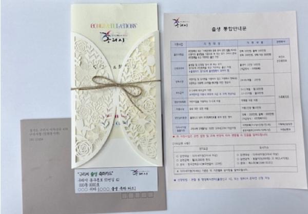 [한국뉴스타임=편집국] 구리시는 2018년부터 출산장려정책의 일환으로 출생신고를 한 구리시민에게 출생 축하카드와 출산에 따른 다양한 복지혜택을 소개하는 통합안내문을 동봉해 발송하고 있다.