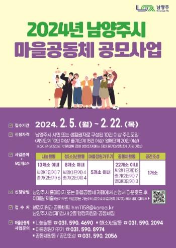 [한국뉴스타임=편집국] 남양주시는 주민의 자발적인 참여와 소통을 바탕으로 마을 발전과 삶의 질 향상을 위한 공동체 활동을 지원하고자 ‘2024년 마을공동체 공모사업’을 추진한다고 5일 밝혔다.