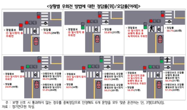 하지만 설문조사에서 경찰청 홍보물을 기준으로 법적으로 올바른 우회전 통행방법에 대한 테스트를 시행한 결과, 우회전 방법에 대해 정확히 인지하고 있는 운전자는 400명 중 1명에 불과했다. 대부분의 운전자들이 서로 잘못된 통행방법으로 우회전을 하다 보니 운전자 간 다툼 등 사회적 혼란만 발생하고 제대로 된 제도 개선 효과를 기대하기 어려운 상황인 것을 알 수 있다.