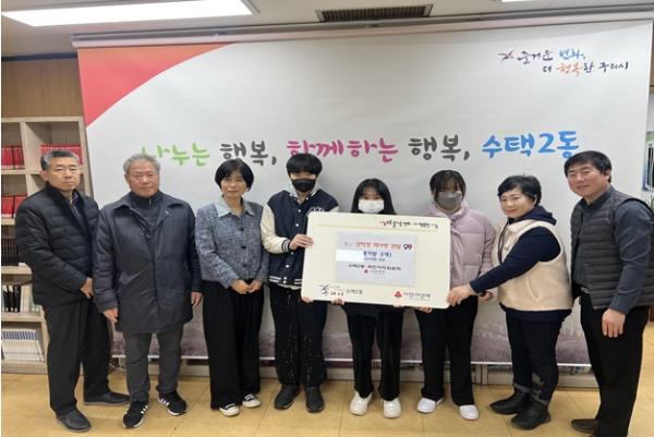 [한국뉴스타임=편집국] 구리시 수택2동 주민자치위원회는 지난 6일, 관내 거주하는 청소년 7명을 선정해 장학금(1명)과 책가방(6명)을 후원해 주는 장학사업을 추진했다.