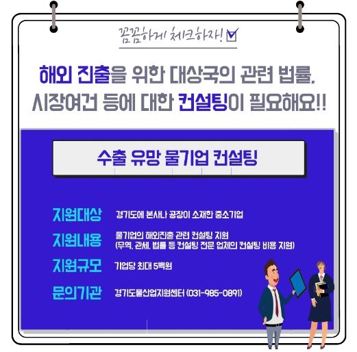 성공적인 해외 진출을 위해 리스크 관리에 필요한 ‘수출 유망 물기업 컨설팅 지원사업’ 참여를 통해 관세, 무역, 법률, ESG, 동향 분석, 조사 분야 등 수출 시 겪는 각종 애로사항을 해결할 수도 있다. 2개 기업을 선착순 모집하며, 기업당 최대 5백만 원까지 총비용의 90%를 지원받을 수 있다.
