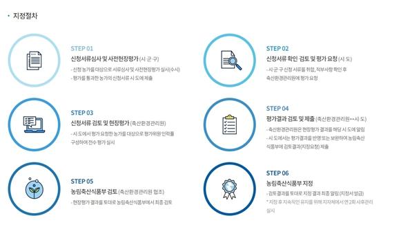 신청 절차는 신청서류심사 및 사전 현장평가→신청서류 확인·검토 및 평가 요청→신청서류 검토 및 현장평가→평가결과 검토 및 제출 (축산환경관리원↔시·도)→농림축산식품부 검토→농림축산식품부 지정이다.