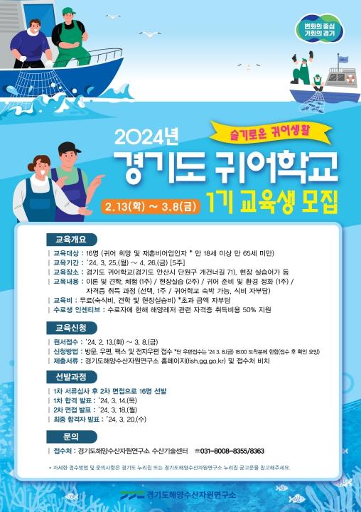 [한국뉴스타임=편집국] 경기도해양수산자원연구소가 귀어귀촌 활성화를 위한 2024년 경기도 귀어학교 1기 교육생을 13일부터 다음 달 8일까지 모집한다.