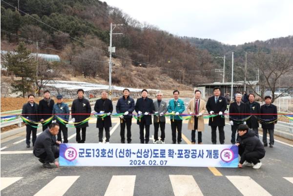 13일 군에 따르면 지난 22년 6월 착공한 군도 13호선(신하~신상) 확포장 공사가 1년 7개여 월 만에 완공돼 그동안 4m 남짓으로 폭이 협소하고 선형이 구부러진 도로를 이용하던 주민들의 교행 불편을 말끔히 해소하게 됐다고 밝혔다.