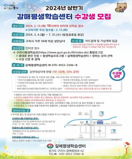 [한국뉴스타임=편집국] 구리시는 오는 3월 4일부터 7월 31일까지 새롭게 개관한 갈매평생학습센터에서 2024년 상반기 과정(3개 분야 34개 강좌)을 운영할 계획이다.