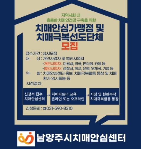 [한국뉴스타임=편집국] 남양주보건소 치매안심센터는 2023년 치매안심가맹점 55개소 및 치매극복선도단체 2개소를 지정했으며, 2024년에도 신규 모집한다고 13일 밝혔다.