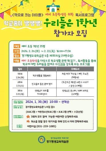 윤재철 경기평생교육학습관장은 “새로운 시작을 앞둔 예비 초등학생들이 학습관에서 다양한 독서 활동을 통해 학교생활에 대해 자신감을 키우고 힘차게 시작하기를 바란다”고 말했다.