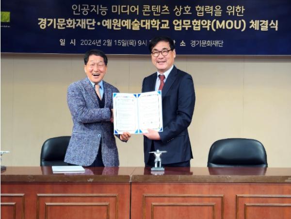 경기문화재단(대표이사 유인택)과 예원예술대학교(총장 직무대행 고광모)는 2월 15일 오전 9시 30분 경기문화재단 다산홀에서 '경기도 지역 인공지능 미디어 콘텐츠' 상호협력을 위한 업무협약을 체결했다.