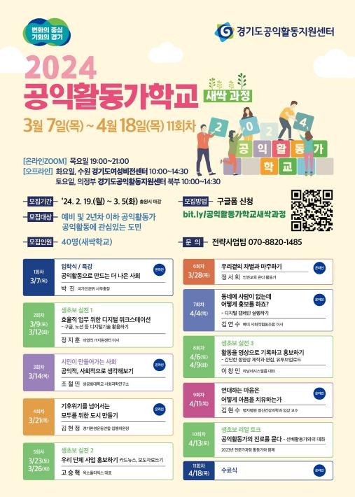 홍보와 접수는 2월 19일부터 센터 누리집과 웹자보를 통해 진행되며, 구글폼(bit.ly/공익활동가학교새싹과정)을 통해 선착순으로 40명을 모집한다.