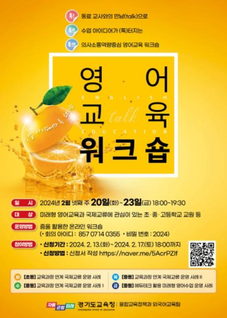 [한국뉴스타임=편집국] 경기도교육청이 ‘톡!톡!톡! 수업 아이디어가 터지는 영어교육 온라인 워크숍’을 오는 20일부터 23일까지 운영한다.