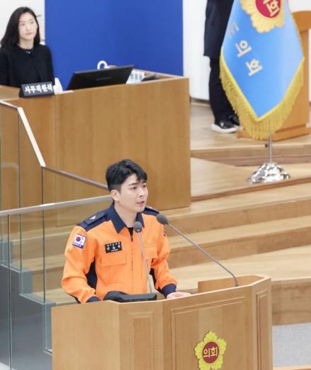 한편, 정동혁 의원은 이날 소방 기동복을 입고 발언대에 올라 화제가 됐다. 정 의원은 지난 10월 고양소방서 명예구조?구급대원으로 위촉되어 북한산 산악구조에 나서는 등 현장에서 근무하는 대원들과 직접 소통한 바 있다.