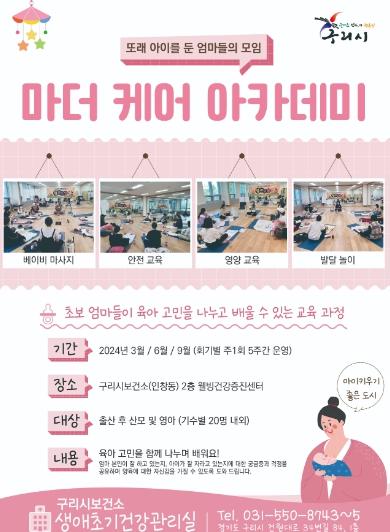 [한국뉴스타임=편집국] 구리시는 오는 3월 6일부터 구리시보건소(인창동) 2층 웰빙 건강증진센터에서 첫아기를 출산한 산모를 대상으로 '마더 케어 아카데미' 과정을 운영한다고 밝혔다.