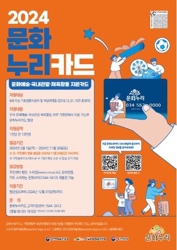 발급기간은 2월 1일부터 11월 30일까지이며, 신분증을 지참하여 가까운 읍·면·동 행정복지센터를 방문하거나 문화누리카드 누리집 또는 모바일앱 접속, 전화 ARS를 통해 신청할 수 있다. 지난해 문화누리카드 이용자 중 수급 자격을 유지한 경우에는 별도의 신청 없이 올해 지원금이 자동 재충전 되어 즉시 이용할 수 있다.