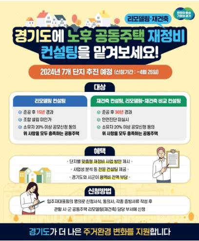도는 4월 26일까지 도내 재건축 및 리모델링 사업을 추진하려고 준비하는 단지 중 시군 추천을 거쳐 7개 단지를 선정한다고 21일 밝혔다.