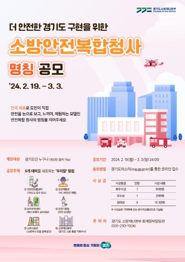 소방안전복합청사 명칭 공모에는 희망하는 경기도민이라면 누구나 참여할 수 있으며 3월 3일까지 경기도의 소리(vog.gg.go.kr) 누리집에 접속해 원하는 명칭을 접수하면 된다.