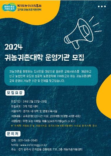 [한국뉴스타임=편집국] 경기도와 경기도농수산진흥원이 운영하는 경기도귀농귀촌지원센터가 ‘2024 경기귀농귀촌대학’ 교육 대행기관을 22일부터 29일까지 공개 모집한다.