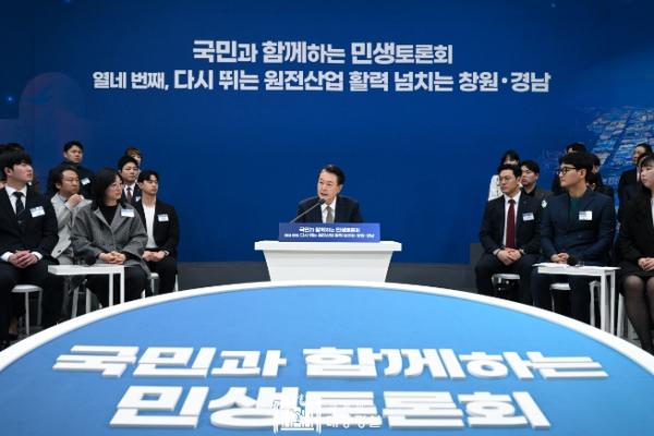 [한국뉴스타임=편집국] 윤석열 대통령은 2월 22일 오전 경남도청에서 ‘다시 뛰는 원전산업, 활력 넘치는 창원·경남’을 주제로 열네 번째 ?국민과 함께하는 민생토론회?를 개최했다. 이번 토론회는 탈원전으로 무너진 원전 생태계를 복원하고, 창원·경남의 지역경제 활성화 방안을 논의하기 위해 마련됐다.