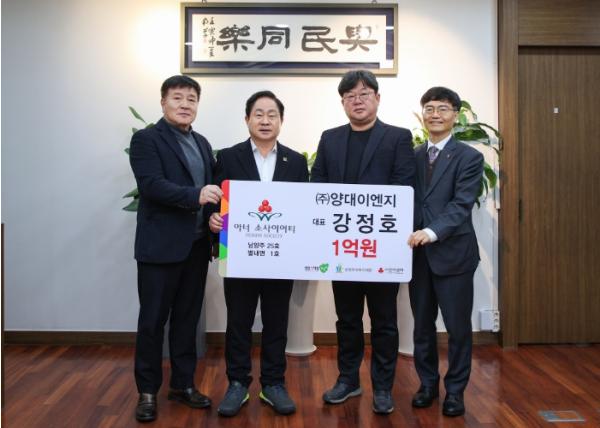 [한국뉴스타임=편집국] 남양주시는 22일 ㈜양대이엔지 강정호 대표가 1억 원 성금을 5년 약정 기부하며 남양주 25호(별내면 1호) 아너소사이어티 회원으로 가입했다고 밝혔다.