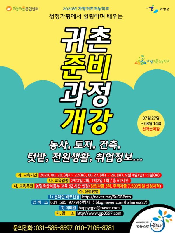 가평군 예비사회적기업인 협동조합공감21 부설 가평귀촌귀농학교(교장 박천행)는 8월 20일부터 진행되는 “2기 귀촌 준비과정 - 현장중심 귀촌준비교육“ 참여자를 7월 27일부터 모집한다.