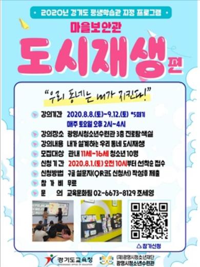 (재)광명시청소년재단(대표이사 서일동) 광명시청소년수련관(관장 김홍열) 이 2020~2021년 경기도교육감 지정 평생학습관으로 선정되어 평생교육프로그램 마을보안관을 운영한다.