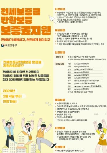 ‘전세보증금 반환보증 보증료 지원사업’은 최근 전세 사기, 역전세 현상 등으로 피해 사례가 증가함에 따라 전세보증금 반환보증 가입을 유도해 주거 안전성을 강화하고 전세 사기 피해를 예방하기 위해 마련됐으며, 사업 선정 시 납부한 보증료의 전부 또는 일부(최대 30만 원)를 지원받을 수 있다.
