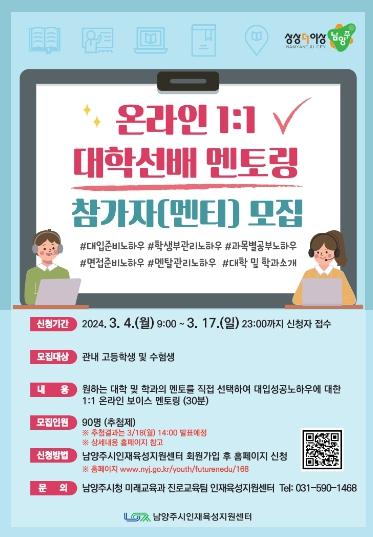 [한국뉴스타임=편집국] 남양주시는 오는 3월 20일부터 5월 31일까지 ‘온라인 1:1 대학선배 멘토링 ’프로그램을 운영한다고 밝혔다.