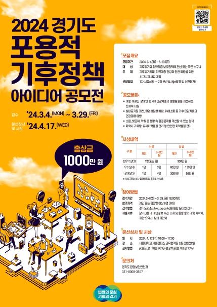 박대근 경기도 환경보건안전과장은 “이번 공모전을 통해 도민이 기후 변화로부터 보호받고 기회를 가질 수 있는 따뜻하고 실용적인 정책들이 발굴되기를 기대한다”며 “국민들의 많은 관심과 참여를 당부드린다”고 말했다.