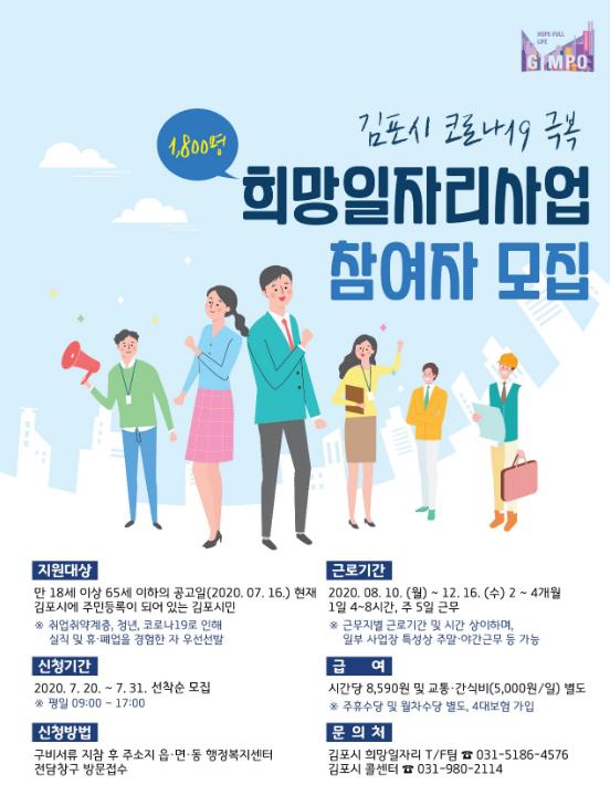 김포시(시장 정하영)는 코로나19로 인한 경제위기에 대응하기 위해 공공일자리를 제공하는 ‘김포 희망일자리 사업’의 모집기간을 연장한다고 밝혔다.