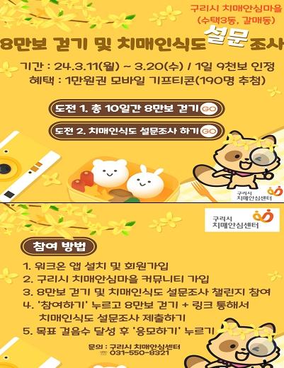 이번 행사는 모바일 앱 워크온 내 ‘구리 치매안심마을 커뮤니티’를 통해 기간 내 8만보 걷기 챌린지를 기본으로 운영하고, 동시에 구리시 치매안심마을 우수 지정을 위한 치매인식도 설문조사도 같이 진행된다. 목표 달성 시 모바일 상품권이 지급될 예정이다.