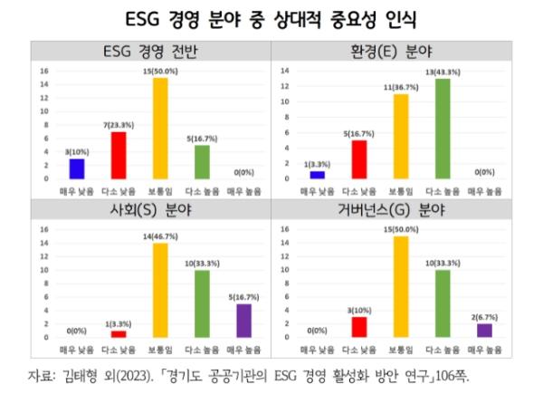 보고서에 따르면 경기도 공공기관은 ESG 경영 3개 분야 중 사회 분야 중요성을 50%로 가장 높게 인식하고 있고, 환경 분야는 43.3%, 거버넌스 분야의 경우 40%로 중요성을 가장 낮게 인식하고 있는 것으로 나타났다. 반면에 2023년 ESG 경영 3개 분야의 공공기관 경영평가 성과는 100점 만점 기준으로 환산했을 때 환경(E)이 평균 66.2점, 사회(S)가 가산점을 합산하여 121.8점, 거버넌스(G)가 76점에 해당하여 사회분야에 대한 평균값이 월등히 높은 반면, 상대적으로 환경과 거버넌스에 대한 평균 점수가 낮은 것을 확인했다.