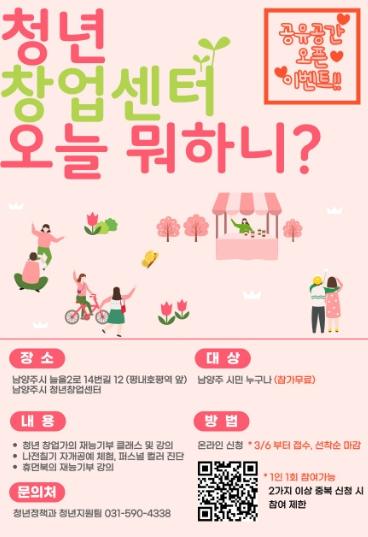 [한국뉴스타임=편집국] 남양주시는 3월 한 달 동안 청년창업센터 3~4층 공유공간에서 시민 누구나 무료로 참여하고 즐기는 다양한 이벤트를 실시한다고 6일 밝혔다.