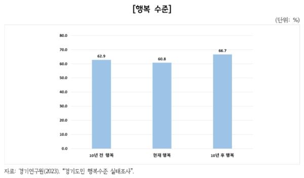 우선 경기도민의 현재 행복 수준을 100점 만점으로 측정한 결과 60.8점으로 나타났다. 도민의 현재 행복 수준을 10년 전과 후(예상)의 행복 수준과 비교한 결과 10년 전 행복 수준은 62.9점, 10년 후는 66.7점으로 나타났다. 과거에 비해 현재의 행복 수준이 높지는 않지만, 미래에는 더 행복해질 것이라는 기대가 반영된 결과로 보인다.
