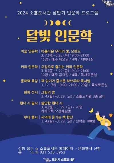 [한국뉴스타임=편집국] 포천시는 오는 31일까지 소흘도서관에서 야간에도 인문학을 즐길 수 있는 ‘달빛 인문학’ 프로그램을 운영한다.