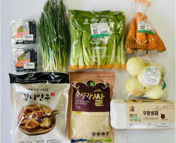 꾸러미 구성은 소양강쌀과 양파, 달걀 등 지역 농산물로 구성했다.