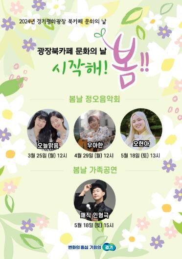 변상기 경기도 행정관리담당관은 “경기평화광장과 북카페는 도민을 위한 공간으로 지식과 문화, 소통과 미래를 위한 기회의 공간”이라며 “새롭게 시작하는 봄의 계절에 맞는 시작과 힐링을 주제로 한 다양한 문화공연을 즐겨주시길 바란다”고 말했다.