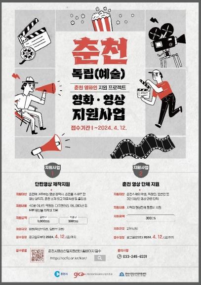 [한국뉴스타임=편집국] 춘천시가 춘천시영상산업지원센터를 통해 오는 4월 12일까지 지역 독립?예술 영화 활성화 및 지역 영상 인재 발굴을 위한 2024년 춘천 독립(예술) 영화?영상 지원사업을 모집한다고 밝혔다.