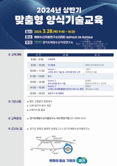 참가자에게는 교육 당일 중식 제공과 교육실적 확인원을 발급하며, 자세한 사항은 경기도해양수산자원연구소 내수면연구팀으로 문의하면 된다.