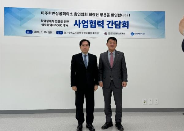 경기주택도시공사(GH)는 미주 한인상공회의소 총연합회와 15일 수원시 광교 복합시설관에서 경기도 스타트업·기업의 글로벌 진출을 돕기 위한 사업 협력 간담회를 열었다.