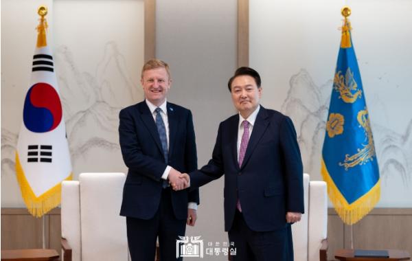 [한국뉴스타임=편집국] 윤석열 대통령은 3월 20일 오전 제3차 민주주의 정상회의 참석차 방한한 '올리버 다우든(Oliver Dowden)' 영국 부총리를 접견했다.