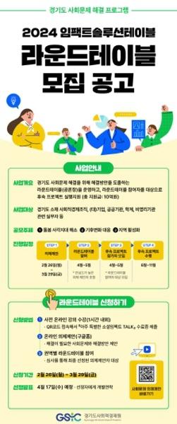[한국뉴스타임=편집국] 경기도사회적경제원은 ‘2024년 사회환경 문제해결 지원사업(임팩트솔루션테이블)’ 참여자를 29일까지 모집한다.