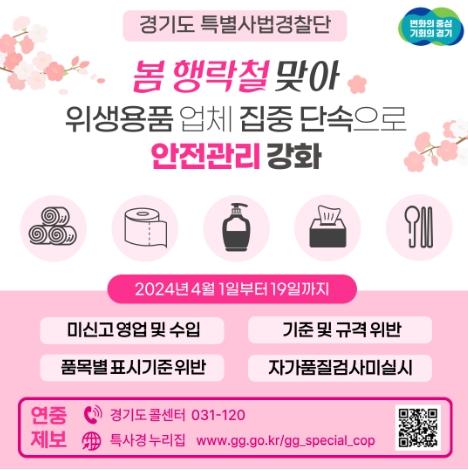 [한국뉴스타임=편집국] 경기도 특별사법경찰단이 4월 1일부터 19일까지 위생용품 제조·수입업체, 위생물수건처리업체를 대상으로 불법행위를 집중 단속한다.