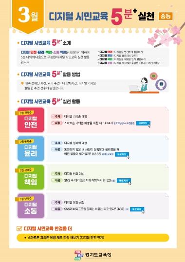 ‘디지털 시민교육 5분+ 실천’은 스마트기기 보급과 활용 증가에 따라 디지털 안전·윤리·책임·소통 역량을 강화하기 위해 5분 내외 내용으로 구성된 디지털 시민교육 실천 활동이다.