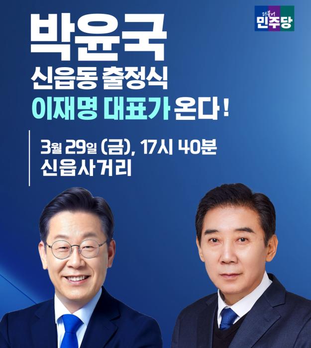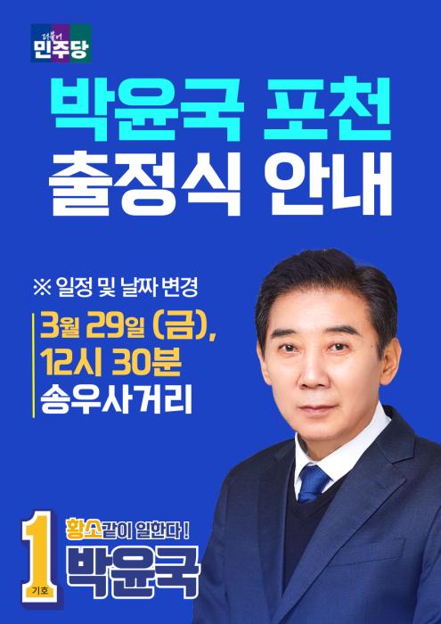 28일 4·10 총선 공식선거 운동이 시작된 가운데 포천가평지역구에 출마한 더불어민주당 박윤국 후보 출정식에 이재명 대표가 지원 유세를 한다고 밝혔다.