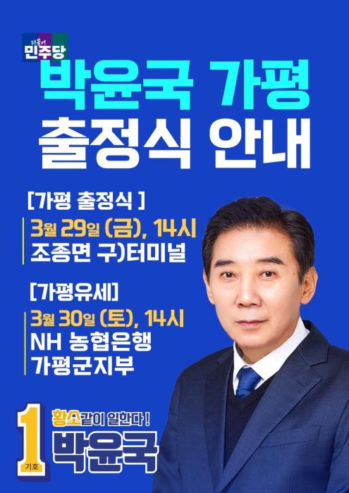 이에 앞서 박윤국 국회의원 후보 포천시 출정식은 29일 오후 12시 30분 포천시 소흘읍 송우사거리, 가평군 출정식은 오후 2시 가평군 조종면 구 터미널에서 하며 30일 오후 3시에는 가평읍 NH농협 가평군지부 앞에서 유세를 시작한다.