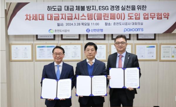 [한국뉴스타임=편집국] 춘천도시공사는 신한은행, 페이컴스와 ‘클린페이’ 도입을 위한 업무협약을 체결했다고 28일 밝혔다.