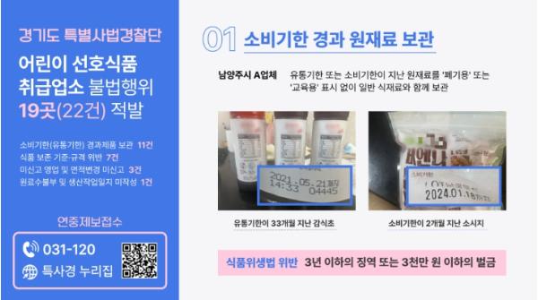 홍은기 경기도 특별사법경찰단장은 “어린이들이 안심하고 구매할 수 있도록 적발된 업체들은 관련 규정에 따라 강력히 처벌하고 지속적인 단속을 통해 도민의 먹거리 안전에 대한 인식변화와 불법행위가 근절될 수 있도록 최선을 다하겠다”고 말했다.