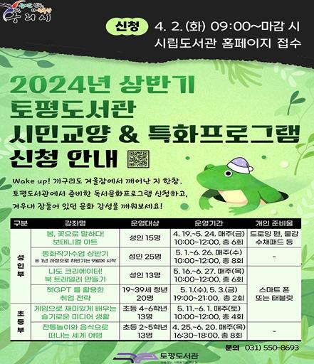 [한국뉴스타임=편집국] 구리시 토평도서관에서 오는 4월 19일부터 6월 27일까지 2024년 상반기 시민교양 및 특화프로그램을 운영한다.