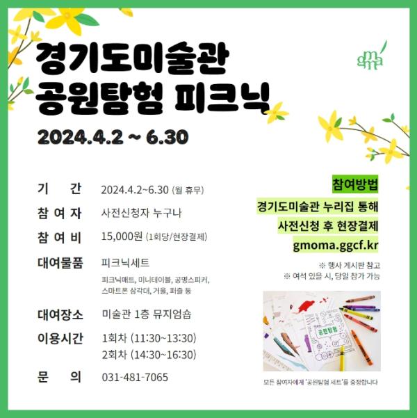 ‘공원탐험 피크닉’은 4월 2일부터 6월 30일까지 11시 30분, 오후 2시 30분 하루 두 차례 운영되며, 경기도미술관 누리집에서 사전 예약하여 피크닉 세트 대여 후 참여할 수 있다. 잔여석이 있을 때에는 현장 참여도 가능하다. 참가비는 1만 5천 원으로 예약일에 경기도미술관으로 방문하여 뮤지엄숍에서 결재하면 된다. 피크닉 세트는 피크닉 매트와 미니테이블, 거울, 휴대폰 삼각대, 휴대폰 공명거치대, 퍼즐 등으로 구성되어 있으며, 참가자들에게는 공원탐험 활동지, 색연필, 비누방울로 구성된 공원탐험세트를 함께 증정한다. 자세한 사항은 경기도미술관 누리집 행사게시판에서 확인할 수 있다.