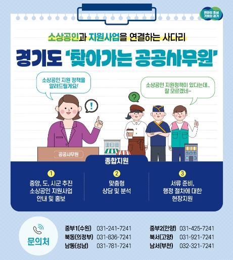 [한국뉴스타임=편집국] #. 용인시에서 해장국집을 운영하는 60대 사장 A씨는 갈수록 떨어지는 매출을 보며 한숨을 내쉬었고, 가게 임대료와 인건비로 하루하루를 힘들게 보냈다. A씨의 시름이 깊어지자 이웃가게 주인은 경기도의 ‘찾아가는 공공사무원’을 소개했다. 가게를 방문한 공공사무원은 A씨가 중소벤처기업부의 소상공인 정책자금을 통해 저리로 목돈을 대출 지원받을 수 있음을 안내했다. 이런 지원사업이 있는 줄도 몰랐던 A씨에게 공공사무원은 온라인 신청방법 등을 자세히 설명했고, A씨는 사업자금을 통해 숨통이 트이게 됐다.