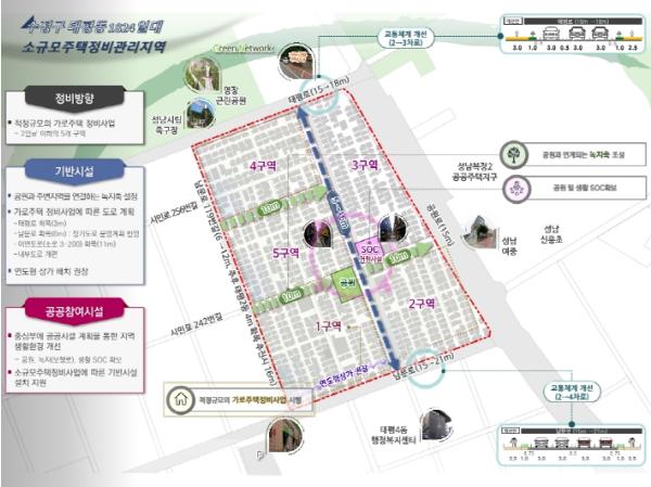 구체적 내용을 살펴보면 성남여중 서측에 위치한 태평동 관리지역은 당초 2개 구역에 대한 소규모주택정비사업을 계획했으나 이번 계획 변경을 통해 전체 관리지역을 5개 구역으로 구분해 전 구역 가로주택주택정비사업을 실시한다. 최대 지하 2층, 지상 20층의 규모로 공동주택 2천377세대를 공급할 수 있는 계획이다. 정비사업 시행 후 유입될 다양한 인구 수요를 고려해 도서관, 노인교실 등 세대통합형 교육?문화 공간을 확충할 계획이다.